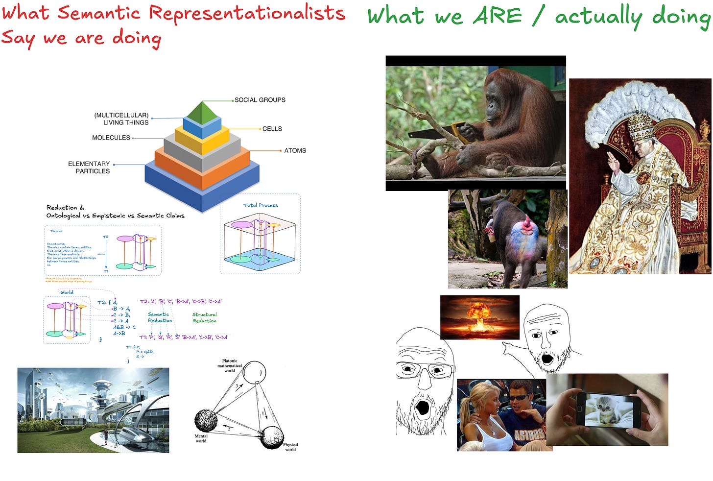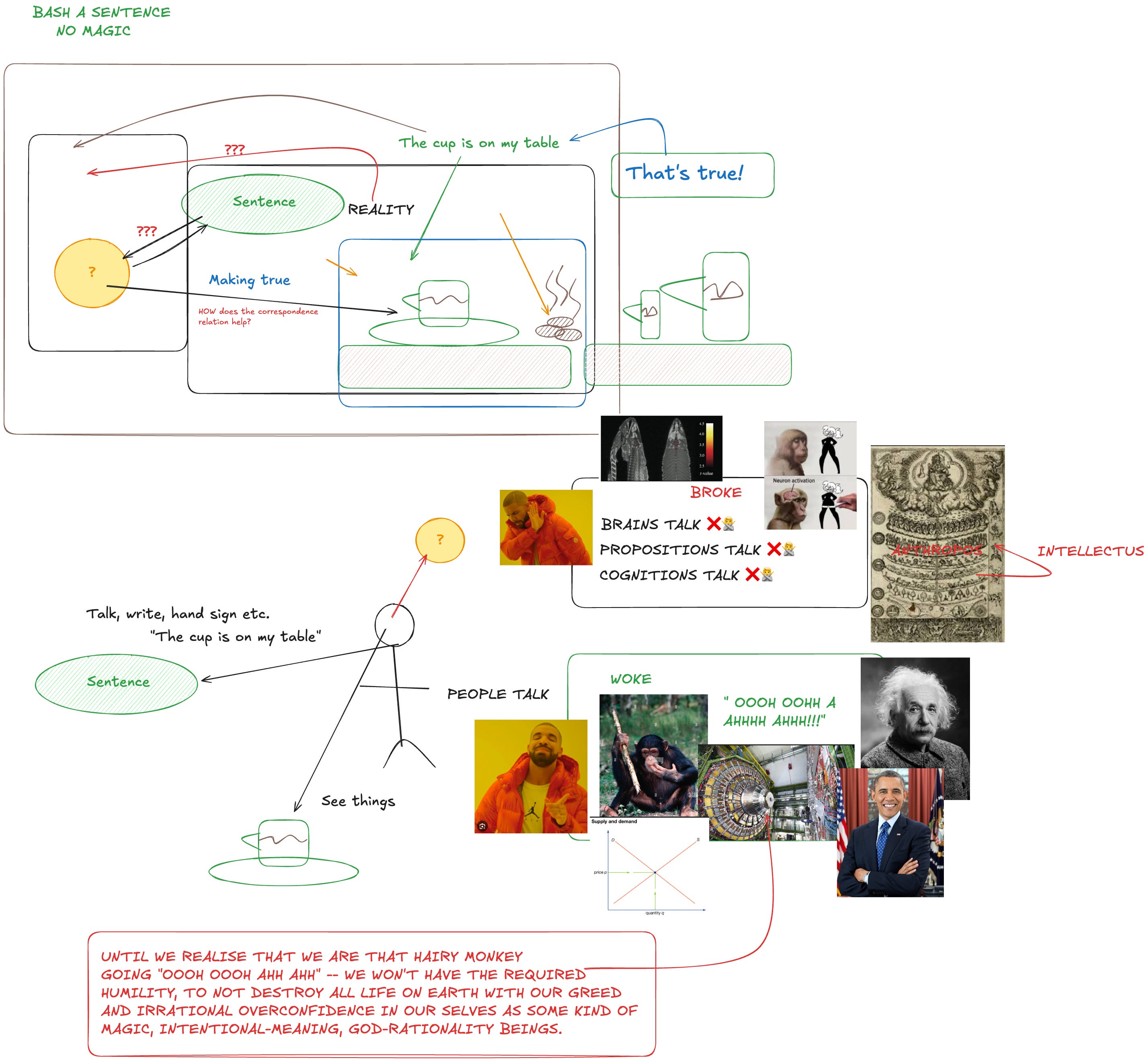 In the case of this example the Semantic/Representationalist assumption seems to be that meanings “stand behind” words as their <referent> or something — it’s hard to say because these views are so hand wavy and depend on familiarising their theorists with terms like “essence”, “nature”, “Form”, “meaning” and so on whilst only using these terms interchangeably with the unclear theory they purport to explain, offering no insight. Even less clear is what “referring” is supposed to mean. I know what it means for ME to refer. I can point with my hand. I can even say a word at the same time. That is not what’s under contention here. We aren’t talking about “referring” as a linguistic act of using a word classified as a grammatical noun in a particular kind of context, but the purported metaphysics that “grounds” (or something) all of that by an occult entity that is the word meaning being “in” or “had by” my mind, causing or being somehow connected to my use of an expression and ALSO “about” “the world” by way of a power called intentionality. What’s that? Well, we said referring terms are about what they refer to, didn’t we, so why not say “about-ness”? Why not? Because how on earth does that help? What the hell is about-ness? Is it made of the same stuff they make McNuggets out of? Through reification and nominalisation, we’ve immediately committed ourselves to a queer slum of occult, bizarre metaphysics.