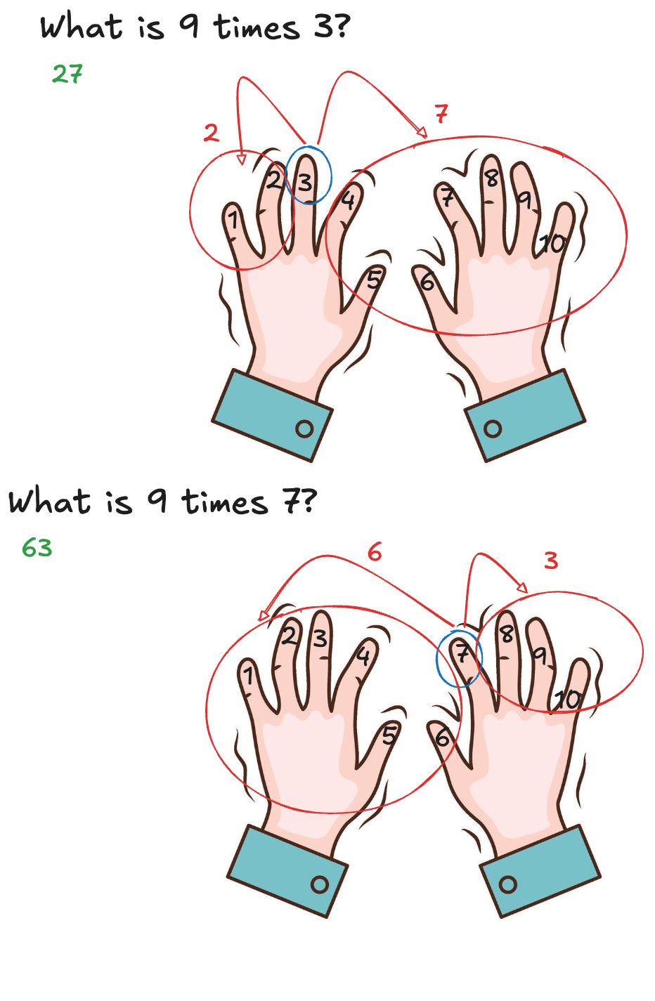 To give an example of an embodied mathematical skill that might be <in your body>, consider a technique you might have learnt in primary school to more easily memorise, or “cheat”, on your nine times tables. This technique involves using your hands ( assuming you have all of your fingers ) and running an index ( starting at 1, I imagine this method is from before Computer Science got big ) for the ordinality of the element in the sequence “multiples of 9” that we are interested in reproducing. You can then look at your hands and enumerate the number of fingers to the left and then to the right of your hand, with the left side giving you the tens position digit, and the right side giving you the ones position digit, which you concatenate as a string, with the concatenated value being the product of nine times our index.