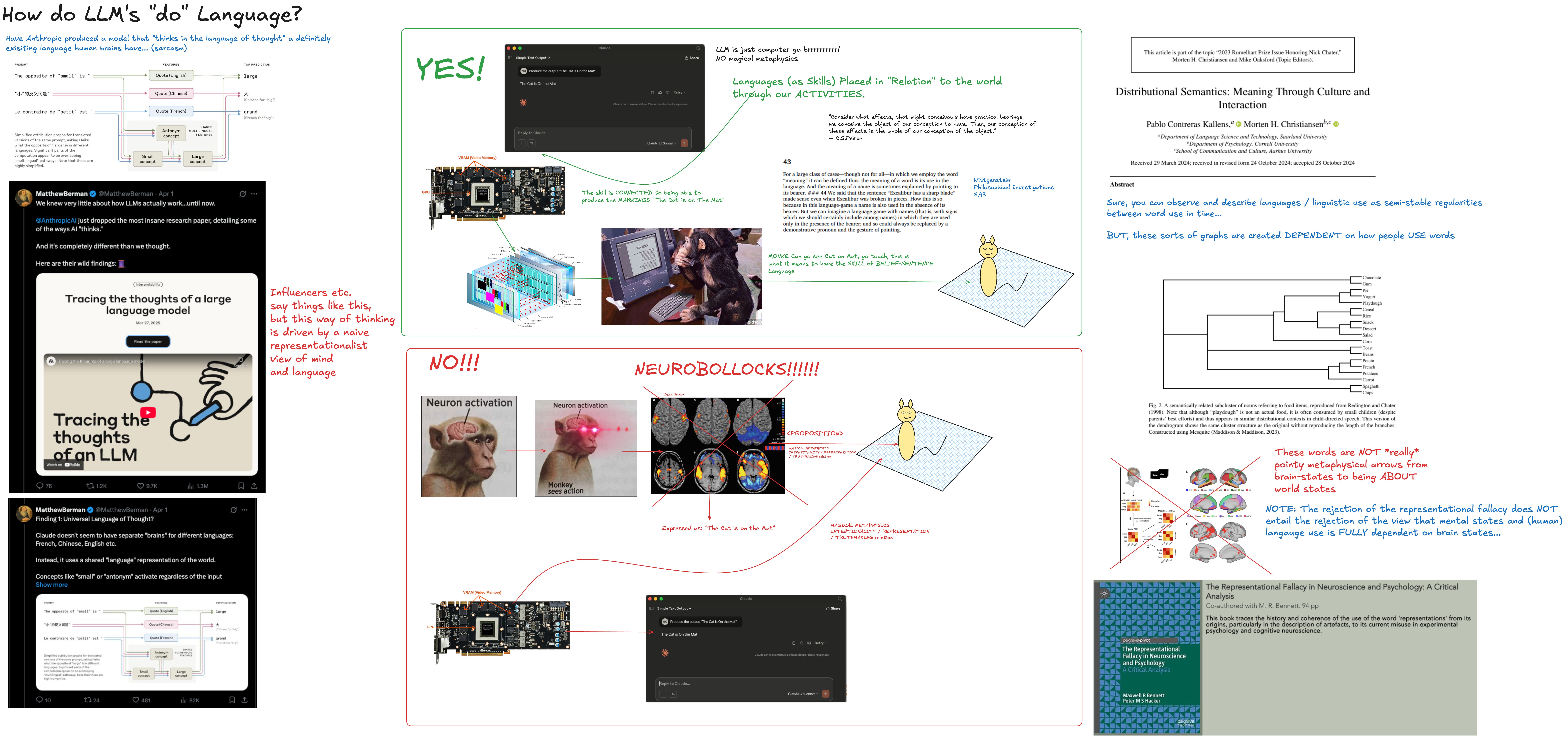 tldr; people are inducted into thinking that there’s this language of thought thingy that truly does the representing in the human mind/brain (non physicalists will reject grounding claims but believe the same stuff about language). And the claim now is that we have LLM’s that are doing this and we can tell this because… idk Anthropic released a blog post that has some arrows on it.