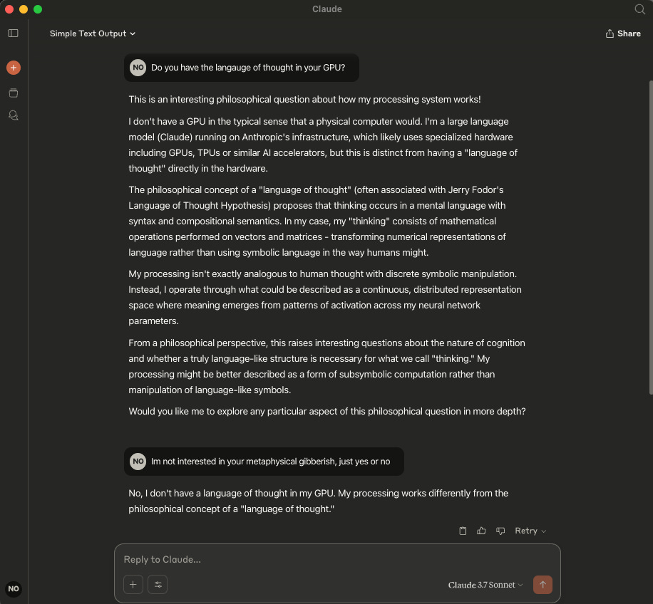 As yet another side note, I reached out to Mr Claude to ask him what he thought about this and he denies that he does in fact have a language of thought in his little silicone brain.