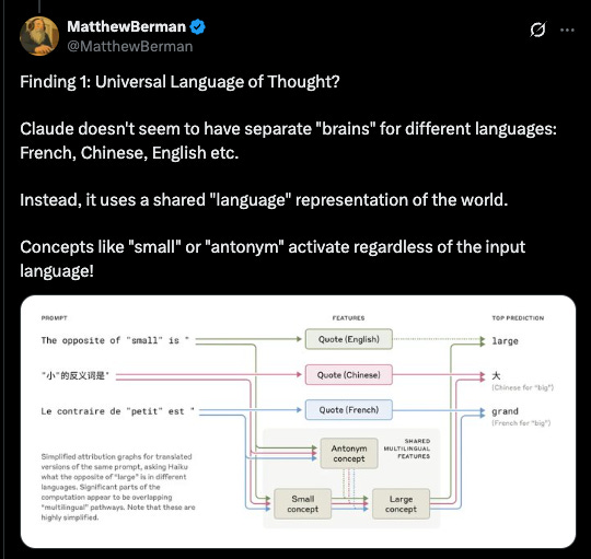 The claim here is that LLM’s are using some kind of “language of thought” that is allegedly definitely present in human brains, and that when we use language it’s that that makes us true language users. The claim of this tweeter seems to be that finally LLM’s like Claude are doing that.
